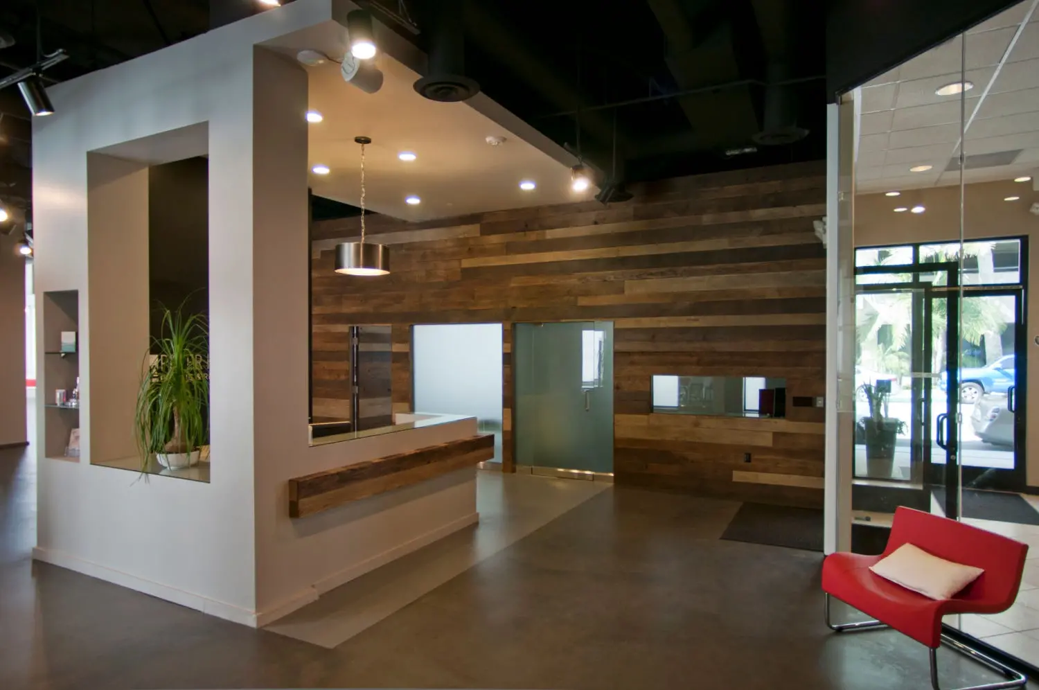 The private offices and examination rooms are located around the periphery of the office while the reception is placed in the center. Unexpected play of materials like concrete and reclaimed wood create visual interest.